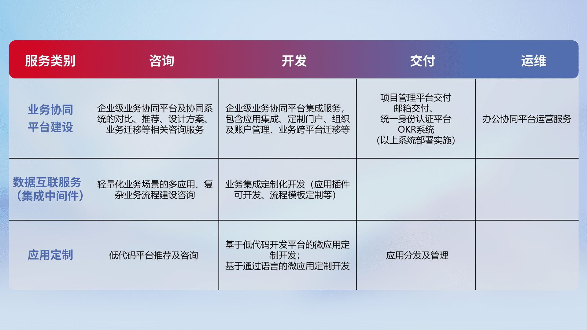 针对钉钉、、、企微、、、IDaas等平台级产品提供产品的规划、、、方案、、、、交付、、、、定制化开发等服务,,,实现如统一协同办公、、、、智能客户服务、、混合会议管理、、、、智能数据查询、、、、等业务场景,,实现数字化转型。。。